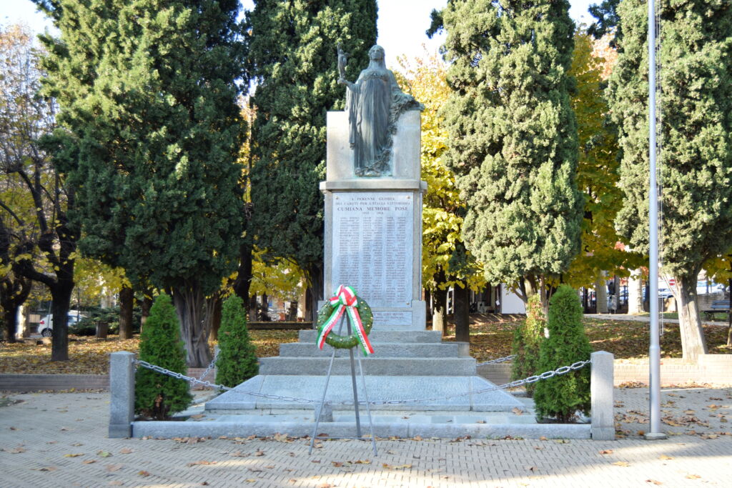 I monumenti, dedicati a perenne memoria dei Caduti di Cumiana, si trovano all’interno dei giardini pubblici in prossimità del Municipio. Il primo è posto su un piedistallo a gradoni, dove è collocata un’alta stele, che funge da sostegno per la statua in bronzo, raffigurante la Patria, nell’atto di porgere un omaggio floreale ai Caduti (i cui nomi sono elencati nella lastra in marmo sottostante), mentre nell’altra mano regge una allegoria della Vittoria.